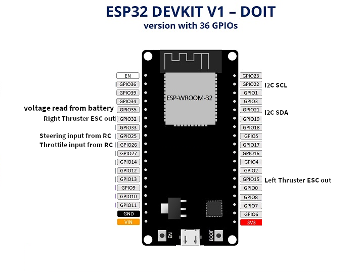 Now comes the fun part, wiring everything up. For my initial tests, i just connected a simple R/C receiver to the ESCs. However the thought of taking my RadioLink remote into the water with me was just a NO. Like most embedded projects I ran to my favorite chip manufacturer Espressif, and grabbed an ESP32.